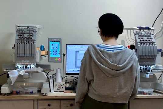 完成したデータをもとにデジタルミシンで刺繍し、その場でワッペンをお作りいたします。