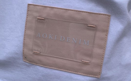 前面に施した大手まんじゅうの甘皮色をイメージしたデニム地がクリスタルレザーパッチ上のホワイトロゴ「AOKI DENIM」を映し出す遊び心のあるデザイン。