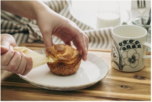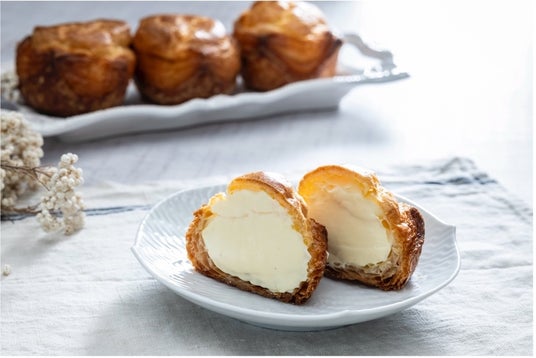 クロワッサンとシュー生地の絶妙な組み合わせから生まれたサクサクのシューに、新鮮な卵を惜しみなく使用したトロトロのクリームを詰め込んだ新感覚のシュークリーム。