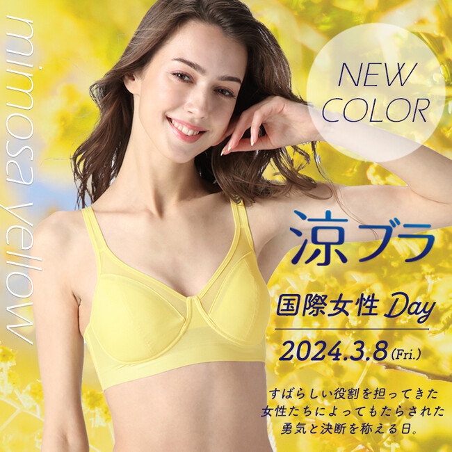 投票の結果、1位となったのは「イエロー」。肌なじみが良さそう、やさしい色、透けなさそう、肩紐が見えてもかわいいなどのコメントが集まり、半数超という圧倒的な支持を得て選出されました(コメントは後述)。同10月には、投票でイエローが1位となったことや、同色を2024年春夏シーズンに売り出すことを発表しましたが、このたび、黄色いミモザの花をシンボルとしている「国際女性デー(3月8日)」のタイミングで、満を持しての発売となりました。