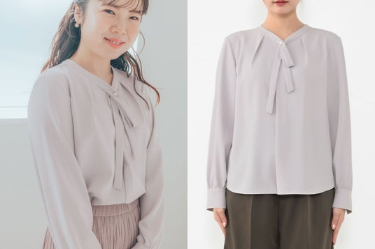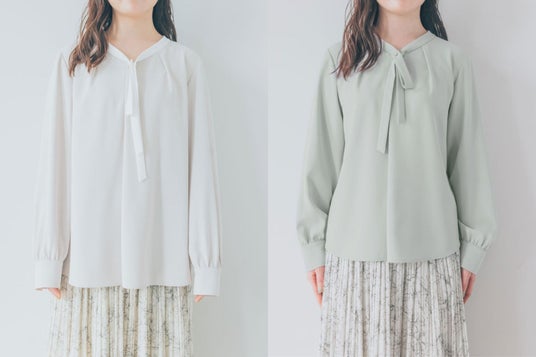 袖丈と着丈は短く設計し、着丈には前後差を加えることで、すっきりとスタイルアップできるようにしました。襟ぐりと肩幅は小柄さんに合わせてサイジングを調整。リボンタイは、印象的に見えるようデザインを工夫しつつ、パールボタンにすることで女性らしいデザインに仕上げました。ラベンダーは、COHINAだけの限定カラーです。