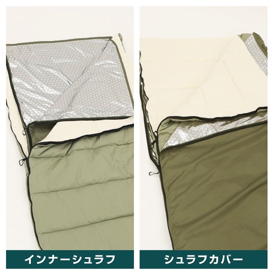 ~シュラフの内部にアルミ蒸着加工を施すことで、体温を反射して保温性を高める!インナーシュラフとしても、シュラフカバーとしても使える~