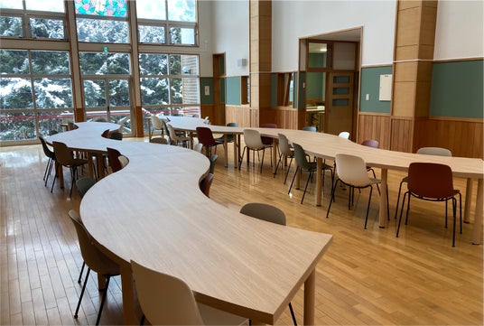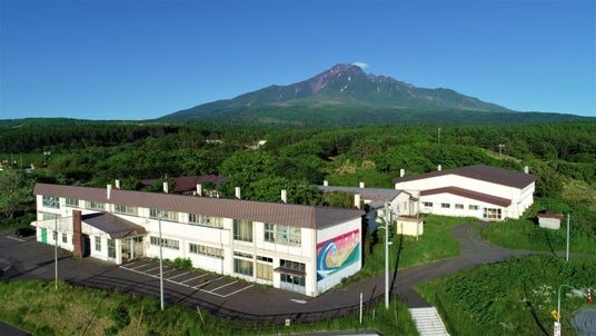 ▼日本百名山の一つ「利尻山」を背景にワークができる、閉校した中学校をリノベ-ションした交流スペース