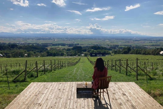 ・馬追の丘陵にあるワイナリー、馬追蒸溜所の葡萄畑の一番上にあるテラス。太平洋側から日本海側まで連なる山々が一望できる。
