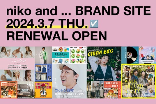 「Play fashion!」をミッションに掲げ、”グッドコミュニティ共創カンパニー”を目指す株式会社アダストリア(本部:東京都渋谷区渋谷2-21-1、代表取締役社長:木村 治)が展開するスタイルエディトリアルブランド「niko and …(ニコアンド)」は、2024年3月7日(木)、オフィシャルブランドサイトをリニューアルいたします。