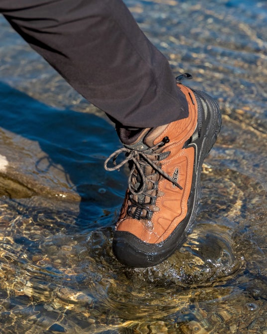 環境に配慮した撥水加工:PFASフリーの撥水機能。シューズボックス内には蒸れを軽減する独自の防水透湿素材「KEEN.DRY(キーン・ドライ)」を採用