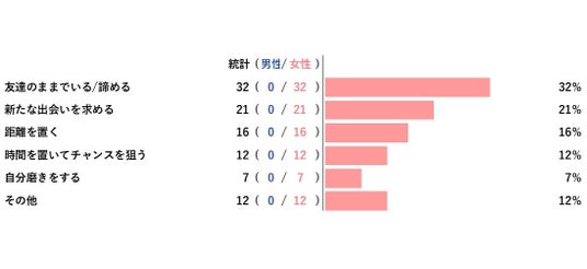 「『付き合えないけど友達でいたい』と言われた時どうしますか?」とアンケート調査をした結果、1位は『友達のままでいる/諦める』でした。1位:友達のままでいる/諦める2位:新たな出会いを求める3位:距離を置く4位:時間を置いてチャンスを狙う4位(同率):その他「実際に「付き合えないけど友達でいたい」と言われた経験のある方は具体的にどんな行動をしましたか?」次に 「実際に「付き合えないけど友達でいたい」と言われた経験のある方は具体的にどんな行動をしましたか?」とアンケート調査した結果、以下の通りになりました。・少しづつ距離をおいた(福岡県女性・28)・友達でいたいということはある程度は信頼関係ができてると思うから(東京都女性・30)・都合の良い女でいた(愛知県女性・27)・気まずくならないように友人関係だった時のように話しをするように努力した(神奈川県女性・37)・次の恋を見つけた(熊本県女性・39)・繋がってはいたいので(大阪府女性・39)・そのまま友達のまま仲良くなる。その間に自分磨きをするためにダイエットやメイクの研究をする(北海道女性・23)・新しい出会いの方が人生が変わるので(神奈川県女性・36)・イメチェンする(栃木県女性・28)──────────────────────────────