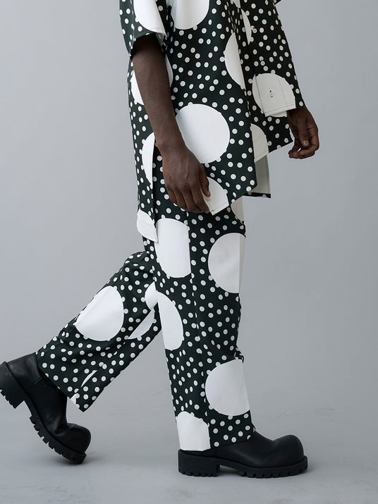 Φ6inchの大きなドットとφ0.5inchの極小ドットをランダムに組み合わせた、dodot.オリジナルドット柄をプリントしたパンツ。ウエストはゴムと調整可能なドローストリング仕様で穿きやすく、裾はワイドにクリースラインを入れることで美しいシルエットに。同グラフィックのシャツとセットアップで着用すれば、個性が際立ちます。