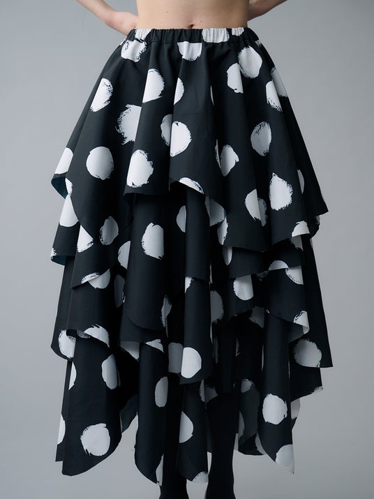 ランダムに入れたドレープスカートに存在感のあるdodot.オリジナルの大きな手描きドット柄をプリント。ウエストをゴムにしているため楽に穿けて、肌触りの良い生地で着心地も良く、インナーペチコート付きのため透けることもありません。ドレープのたっぷりと入ったボリューム感を楽しめる一着に。