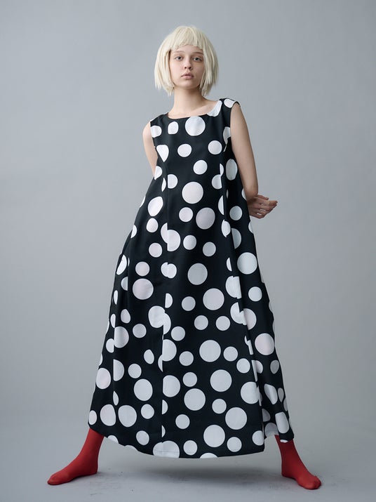 φ3inchとφ2inchのドットを組み合わせたオリジナルドット柄のプリントワンピース。1枚でも着やすいシルエットになるよう、デコルテを美しく見せる首周り、すっきりとした脇下のラインにこだわったデザインです。