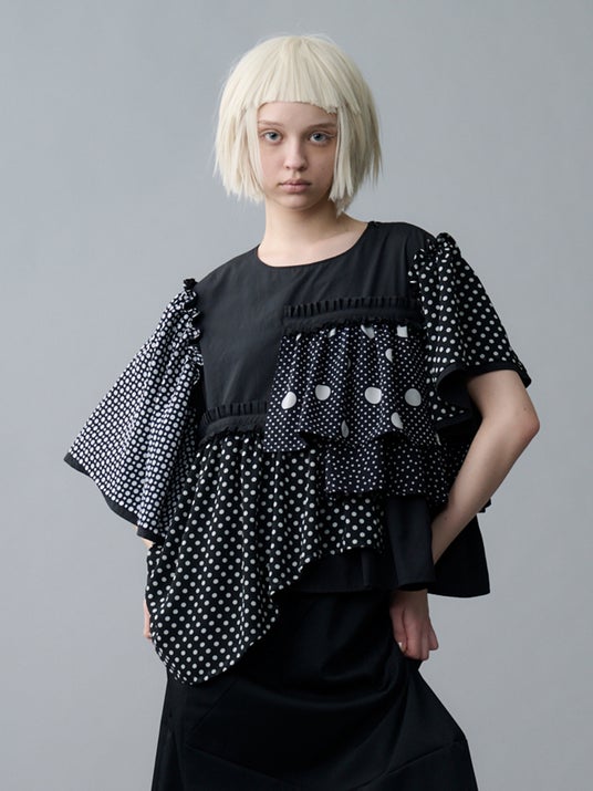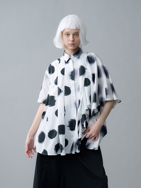アシンメトリーなフレア袖デザインに「Unclear(曖昧)」シリーズのdodot.オリジナルドット柄をプリントした変形ブラウス。細かく入れたフレアプリーツでボリューム感たっぷりなデザインです。