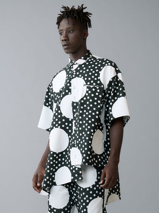 ランダムに切り貼りされた、インパクトのある幾何学的ドットグラフィックを使用したシャツワンピース。ゆとりのあるシルエットで、着やすいデザインに。