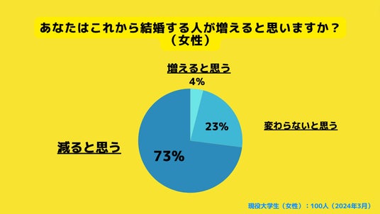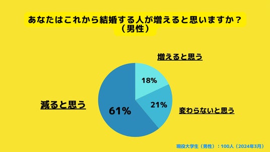 男子大学生の61%、女子大生の73%が「これから結婚する人が減ると思う」と回答し、一方で「これから結婚する人が増えると思う」と回答したのは、男子大学生の18%、女子大学生の4%にとどまりました。