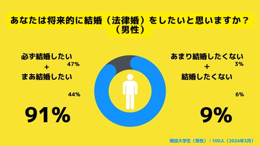 一方で男子大学生の91%、女子大生の85%が「結婚したい」と回答。