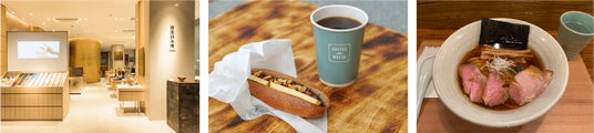 写真左:箔座日本橋、写真中央:re:Dine 日本橋室町、写真左:Homemade Ramen 麦苗室町