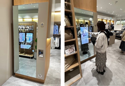 店内には最新のミラーサイネージを導入し、骨格診断やパーソナルカラー診断をするなど、お買い物に楽しい演出を加えます。さらに、商品のバーコードをかざすと商品詳細の閲覧や、リアルタイムの在庫情報確認が可能になります。カメラマークを押すと動画撮影もでき、気になる後ろ姿や動いたときの雰囲気を確認することができます。 また、店舗入口には会員バーコードをかざすと、購入の有無を問わず来店ポイントを獲得できる端末を設置いたします。