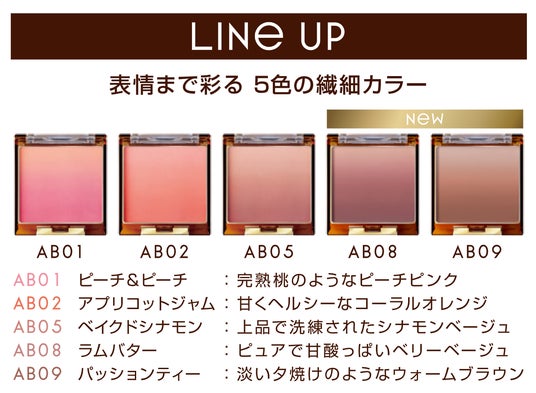 このたびの新色「AB08(ラムバター)」は、ベージュ・カシスピンク・モーヴピンクのグラデ―ションで構成された、ピュアで甘酸っぱいベリーベージュ。「AB09(パッションティー)」はラベンダー・オレンジ・ベージュブラウンが重なる淡い夕焼けのようなウォームブラウンです。それぞれ中間には血色感をもたらすピンク系・オレンジ系カラーを織り交ぜているため顔色がくすまず、絶妙なグラデーションが誕生します。