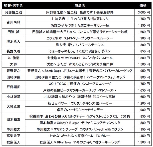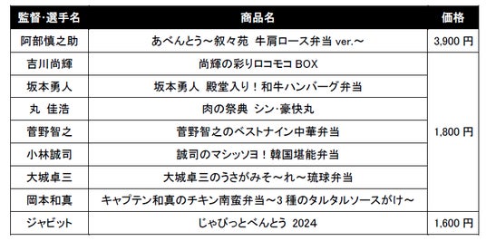 毎年好評の「監督・選手プロデュース弁当」は、監督・各選手の思い入れのあるグルメがぎっしりと詰まっています。今年は新たに阿部監督が加わり、さらに盛りだくさんのラインナップとなります。
