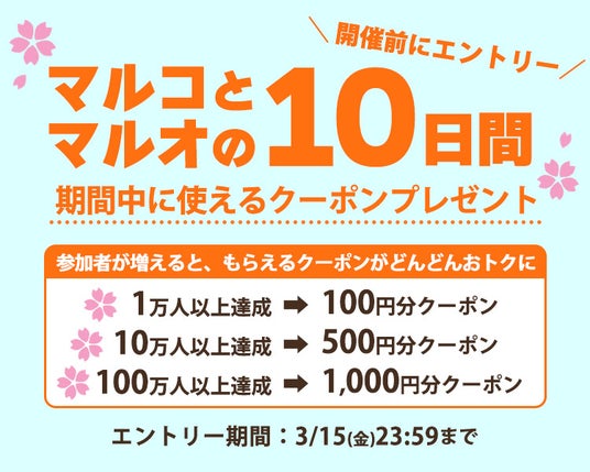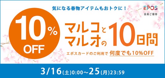 株式会社丸井グループ(本社:東京都中野区、代表取締役社長:青井 浩)は、2024年3月16日(土)~3月25日(月)の10日間、マルイのネット通販「マルイウェブチャネル」にて、エポスカード会員さまご優待キャンペーン『マルコとマルオの10日間』を開催いたします。期間中、エポスカードのクレジット払いで10%OFFにてお買物いただけます。