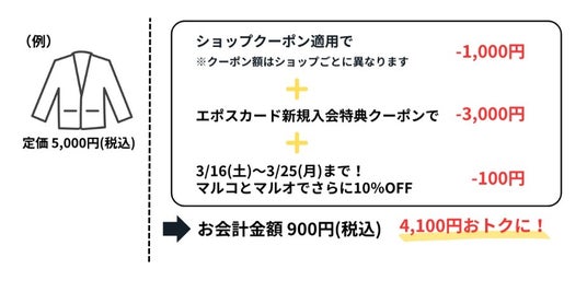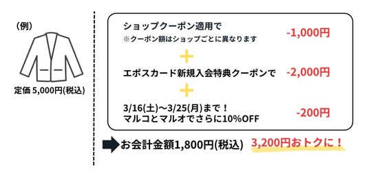 ※クーポンはマルイショッピングアプリの通知、あるいはメールマガジンにてお送りいたします。3月15日(金)23:59までにアプリの通知設定、メールマガジンの登録が必要です
