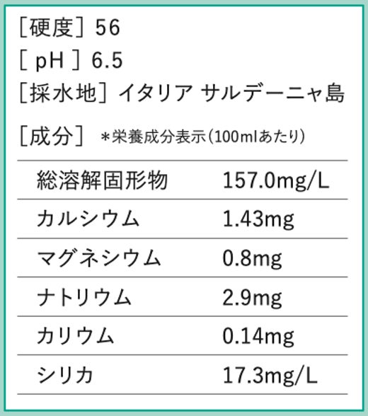 その上、ヨーロッパでは成分表示の中でも最も重要視されている総溶解固形物(TDS)の数値が、157mg/Lと低く、乳幼児にも安心してお飲みいただけます。