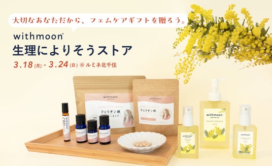 ルミネ北千住の国際女性デーに合わせた取り組み「KNOW YOU , KNOW FEMCARE」のフェムケアイベントに「withmoon 生理によりそうストア」を初出店いたします。POPUPストアでは「大切なあなただから、フェムケアギフトを贈ろう。」をコンセプトに、生理にまつわる女性特有の悩みや不安をサポートできるような商品をご用意しました。さらに、国際女性デーのイメージフラワーであるミモザを取り入れたアイテムとして、容器が新しくなって新登場の「フェミニンウォッシュ」と「オイルセラム」のミモザの香りバージョンを開発し、数量限定で販売いたします。 ギフトセットとしてもご用意するので、大切な方への贈り物や自分自身へのご褒美に選んでいただけたら嬉しいです。