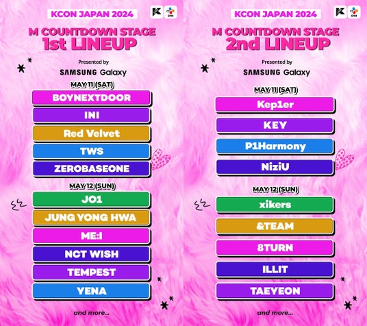 今年1月、日本の京都を皮切りに福岡、埼玉、宮城、神奈川、ソウル、愛知、大阪など韓国と日本の8都市で初の単独ツアーを披露し活発な活動を繰り広げたグローバルグループ&TEAM。日本デビューシングル「RU-PUM PUM Japanese ver」を発売し、活発にグローバル活動を展開している8TURN。昨年5月にデビューし、デビューから1年経たずに各種授賞式で計8つのトロフィーを手にした新鋭で、4月にカムバックを控えるBOYNEXTDOOR。10代のリアルさと想像力を込めたデビュー1stミニアルバム「SUPER REAL ME」をリリースしたBELIFT LABの新人ガールズグループILLIT。デビュー以来、5作連続シングルハーフミリオン達成を記録しているグローバルボーイズグループで、2月に初の単独ドーム公演を開催、日本全国ツアーでは観客20万人を動員し、強烈なパフォーマンスパワーを見せるINI。名実共に日本を代表するアイドルとして2年連続紅白歌合戦出場、単独ドームコンサート開催、アジアツアーなどグローバルな活躍を繰り広げ、5月29日にカムバックを控えるJO1。最近アジアツアーのフィナーレ「2024 JUNG YONG HWA LIVE Your City IN SEOUL」を通じて力を見せつけたCNBLUEのメンバー JUNG YONG HWA。日本でシングル3作を発売して「FLY」シリーズを完成し、ファンの熱い反応に支えられ、昨年初のアリーナツアーと今年初の日本ファンコンサートを盛況裏に開催、5月8日には日本1stアルバム「Kep1going」を控えるKep1er。SHINeeのメンバーであり、特有のコンセプチュアルな魅力で独歩的な音楽世界を作り出している代替不可能な魅力のアーティストKEY。投票数約9,000万票と高い話題を集めた「PRODUCE 101 JAPAN THE GIRLS」を通じて誕生した11人組ガールズグループで、4月17日のデビューシングル「MIRAI」の発売を控え、早くも熱い注目を集めているME:I。NCTの最後のチームとして、日韓同時デビューするやいなや各種音楽チャート1位を席巻、歌謡界に「WISH」旋風を巻き起こしているNCT WISH。6月に横浜、7月には大阪で「NiziU Fan Meeting with U 2024 Nizi”U”niversity」を控えているガールズグループNiziU。初の正規アルバムでキャリアハイを記録、アメリカ「The Governors Ball Music Festival 2024」の舞台にK-POPボーイズグループ初出演を決め、注目を集めるグループP1Harmony。多様なジャンルの人気曲を数多く披露し、大衆から愛されてきたグループRed Velvet。少女時代のメンバーとして3月ガールズグループ個人ブランド評判1位を記録、デビュー18年目で格別な存在感と影響力を誇っているレジェンドアーティストTAEYEON。最近5thミニアルバム「TEMPEST Voyage」を発売、グループ固有のアイデンティティを繰り広げているTEMPEST。アメリカの音楽専門メディアGRAMMY.comが選定した「2024年注目すべきK-POP新人11チーム」に名を連ねた6人組ボーイズグループTWS。デビューアルバムであるミニ1集「HOUSE OF TRICKY:Doorbell Ringing」でデビュー12日で「ビルボード200」へのチャートインに続き、ミニ3集「HOUSE OF TRICKY:Trial And Error」で該当チャート73位を占めるなど第5世代の代表走者として活躍を繰り広げているグループxikers。今年初め、3rdミニアルバム「GOOD MORNING」の活動を盛況のうちに終え、日本での2枚目のシングル「DNA」で活発な活動を繰り広げているYENA。3月20日、日本デビューシングル「ゆらゆら-運命の花-」を発売、日本最大音源サイトであるLINE MUSIC主要チャート1位、グローバルプラットフォームSpotify累積ストリーミング100万回突破などグローバルでも注目される第5世代グローバルボーイズグループZEROBASEONEが出演する。