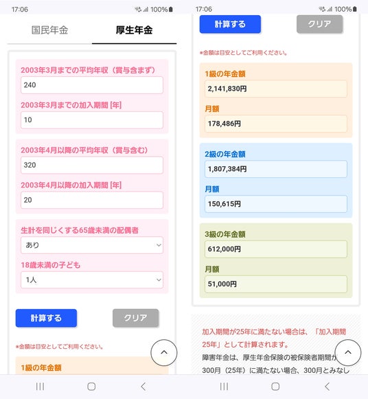 障害年金シミュレーションも基本的な仕様は同じですが、1級、2級、3級の金額がわかるようになっています。加入期間が25年未満の数字を入力した場合は、自動的に25年として計算されます。