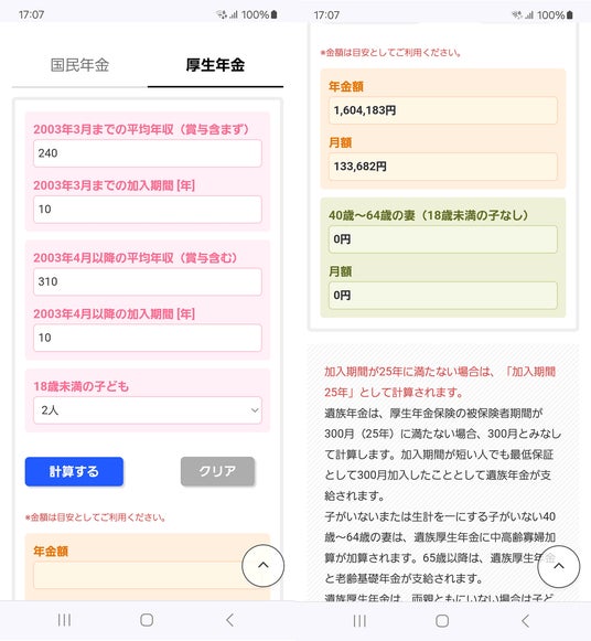 遺族年金シミュレーションも基本的な仕様は同じですが、40歳~64歳で18歳未満の子どもがいない方は別で計算するようにしています。加入期間が25年未満の数字を入力した場合は、自動的に25年として計算されます。