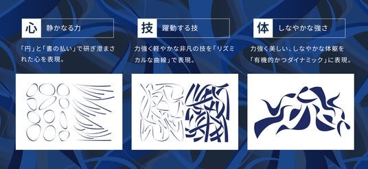 アスリートの心・技・体を表現したエッセンスを融合することで無限の可能性を表現しています。心の落ち着きを表す円や、自ら未来を切り開く強い意志を日本書体の払いで表すことで研ぎ澄まされたアスリートの心を表現した「静かなる力(心)」。晴れ舞台で縦横無尽に力強く、かつ軽やかに動くアスリートの非凡の技をリズミカルな曲線で表現した「躍動する技」。アスリートの力強く美しい動き、しなやかな体躯をダイナミックに有機的なデザインで表現した「しなやかな強さ(体)」といった、日本の美意識とスポーツのエッセンスを表現したデザインをグラフィックデザイナーの小林 一毅氏と協業で制作しました。