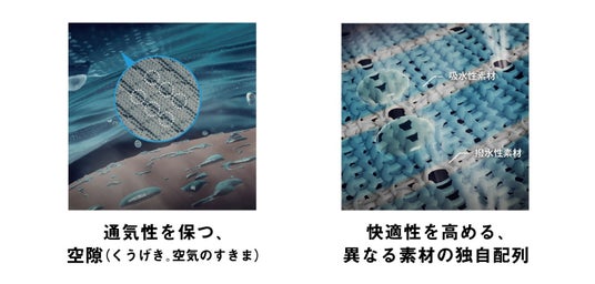 『ドライエアロフロー』は、水の保水量を抑える「疎水・撥水糸」と水を吸い込む「吸水糸」を組み合わせた構造により、汗の膜ができにくく、通気性を保つ生地設計にしています。そのため、汗が気化する時に、体から熱を奪う作用によって放熱性を高め、クーリング機能を発揮するミズノ独自開発の素材です。