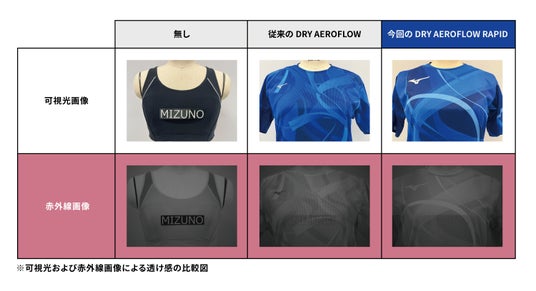 今回『ドライエアロフロー』の機能性に加えて、近赤外線領域の吸収性に非常に優れた特殊な繊維をテキスタイルに応用した『ドライエアロフローラピッド』を開発しました。特殊な繊維が吸収した赤外線(熱)を水分の気化に利用することで生地の蒸散性を促進しました。また、特殊な繊維が人体側からの赤外線を吸収する事で、赤外線カメラに対する防透け性を向上し、特に女性アスリートを守り、競技に集中できる環境をサポートします。