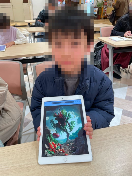参加者作「野菜怪獣」の生成イラストAIの基本的な説明を聞いた後、参加者はアプリを通じて自由な発想でイラストを生成しました。