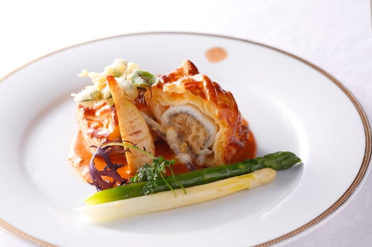 伊勢海老にしっとりとした食感の舌平目をまとわせて、パイで包み焼き上げることで旨味を閉じ込め味わい豊かな一品に仕上げました。伊勢海老から溶け出した濃厚なエキスのソースとお召し上がりください。