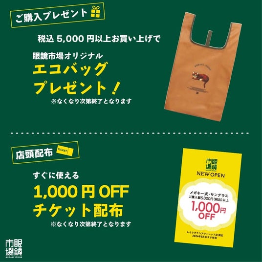5,000円(税込)以上お買い上げで眼鏡市場オリジナルエコバックをプレゼントいたします。また、店頭にて数量限定で1,000円OFFチケットを配布しております。
