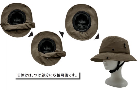 撥水加工を施しているナイロン素材を採用。さらにUVカットを施しているため、日焼け止め対策も万全。さらにヘルメットハットには、首後ろにつば部分に収納できる日よけ付で、これからの季節に最適です。