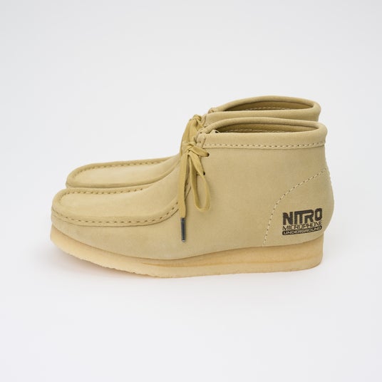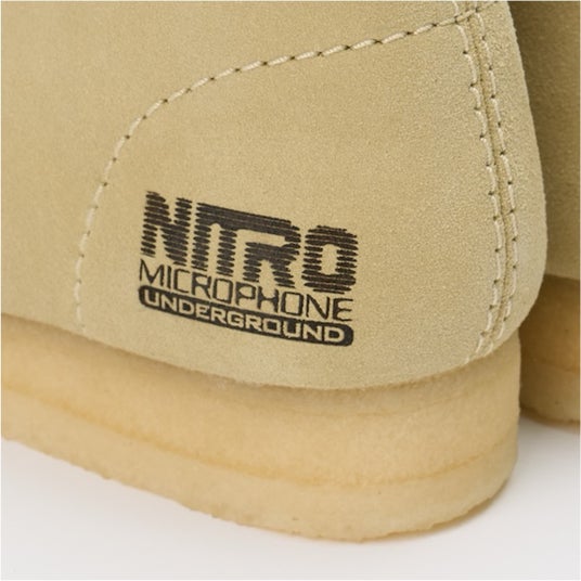 NITRO MICROPHONE UNDERGROUND Official Shopを運営する株式会社ブーマー (本社所在地:東京都渋谷区)は、今年、デビュー25周年を迎えるNITRO MICROPHONE UNDERGROUND(ニトロマイクロフォンアンダーグラウンド/以下NMU)」の記念すべきアニバサリーイヤーに、上野アメ横の老舗スニーカーショップ「山男フットギア(YAMAOTOKO FOOTGEAR)」 が英国発の老舗シューズブランド、〈Clarks ORIGINALS〉の〈Wallabee Boot〉をNMU仕様にカスタムしたスペシャルエディションを発売。