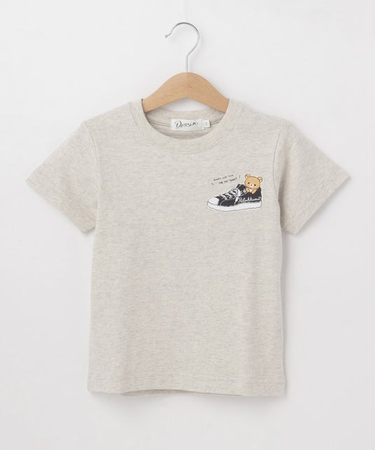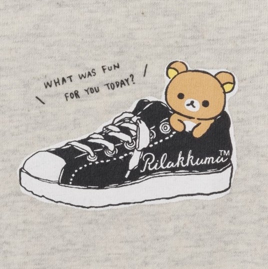 スニーカーの中に入ったリラックマが愛らしいワンポイントTシャツ。同デザインのキッズアイテムとリンクコーデを楽しむことができます。