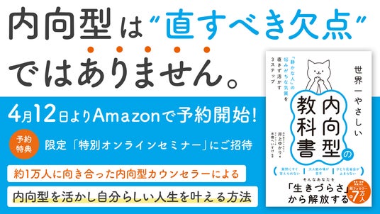 これまで約1万人の内向型の方と関わってきた内向型カウンセラーである井上ゆかりの著書『世界一やさしい内向型の教科書「静かな人」の悩みがちな気質を直さず活かす方法』が、株式会社世界文化社(本社所在地:東京都千代田区 代表取締役社長:鈴木美奈子)より予約販売を開始しました。本書は2024年5月26日(日)に刊行します。