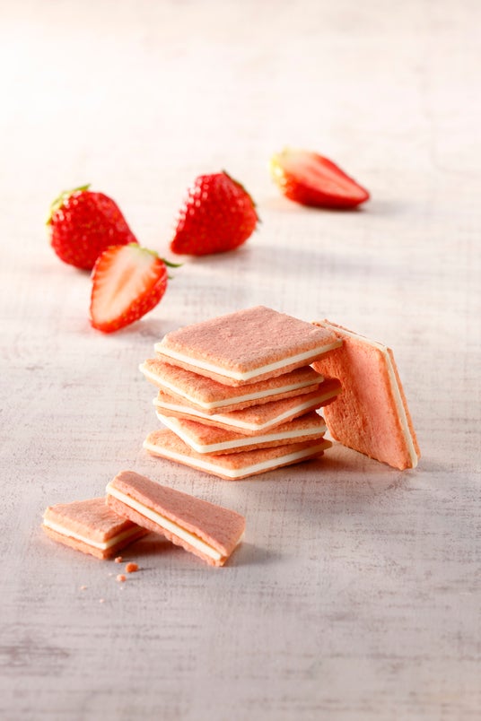 「ストロベリー&マスカルポーネクッキー」(10枚入 税込 1,296円)「ストロベリー&マスカルポーネクッキー」(10枚入 1,296円)は、春らしい華やかなピンク色のフルーティーなストロベリークッキーでミルク感のあるやさしい甘さのマスカルポーネチーズ風味のチョコレートをサンドした、サクサク食感のクッキーです。