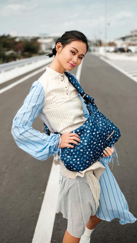 「TASUKI FUSSBAG」(Mサイズ 税込 17,600円) ※画像はTASUKI BELT(税込 6,600円)との組み合わせ。服を着るような感覚で楽しめる「TASUKI FUSSBAG」(Mサイズ17,600円)のアーティストとのコラボシリーズがイベントショップに新登場。無地とはひと味違ったプレイフルな世界観を感じられます。