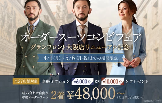 グランフロント大阪店のリニューアルを記念して「オーダースーツコンビフェア」を本日4/1~5/6まで全37店舗で開催!