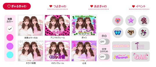 テイストに合った背景(4種類)・フレーム(6種類)・スタンプ(10種類)を搭載したらくがきパレット(ぎゃるきゃわ)