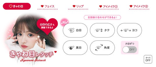 また、レタッチ機能には白目の範囲を調整できる機能「きゃわ目レタッチ」を初搭載。目全体だけでなく、白目の範囲を広げることでより大きくたれ目風の印象に仕上げたり、狭くして黒目を際立たせたりできるなど、これまで以上に理想の目元の盛れ感を追求いただけるようになりました。