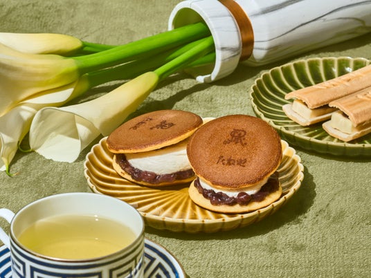 スイーツのお重には、たねやの職人がうつろう季節に寄り添い丁寧に創りあげる、味わいも細やかな和菓子の真髄、上生菓子をご用意。紫陽花や夏の夜空を彩る花火などをうつした、月ごとに異なる季節の上生菓子をお楽しみいただけます。滋賀羽二重糯に十穀をあわせ、芳ばしいきな粉をかけていただくおはぎのほか、「生寒氷 バラの香り」は、その場でお召し上がりいただくアフタヌーンティーだからこそ実現できる、とろけるような食感。セントレジス創業者の母であるアスター夫人が愛したローズのエッセンスを加え、華やかな香りを纏います。お重と一緒にお持ちする、絶妙な焼き具合で色よくふっくらとした生地のたねやの「生どらやき」には、セント レジス ホテル 大阪のペストリーシェフこだわりの、優しく繊細な味わいの生クリームを合わせ、セントレジスとたねやのロゴの焼き印を入れました。