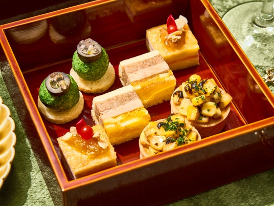 セイヴォリーのお重には、夏の味覚で彩った美しく鮮やかな色合いのセイヴォリーの数々が並びます。セント レジス ホテル 大阪のために特別に選ばれた、京都府宇治市のWABISUKE養鶏場のケージフリーの卵を使用したブリオッシュを合わせた「ダックフォアグラ 合鴨コンフィー オレンジのテリーヌ ブリオッシュ」や、とうもろこしの甘味とチョリソーの辛みが相まる「とうもろこしとチョリソーのキッシュ」など、季節の豊かな恵みとセント レジス ホテル 大阪の上質で洗練された味わいをお愉しみください。