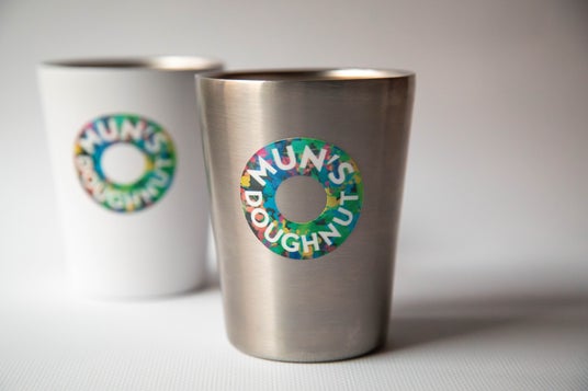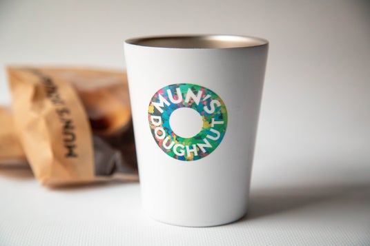 視線入力アプリEyeMoTを使って描く鮮やかな作品がMUN’S DOUGHNUTのロゴを彩り、オリジナルタンブラーになりました。