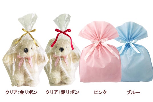 クリアラッピングに赤いリボンが新登場。ウエイトベアが入ったラッピングに赤いリボンが良く映えます。