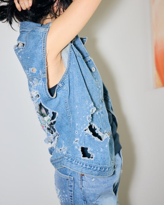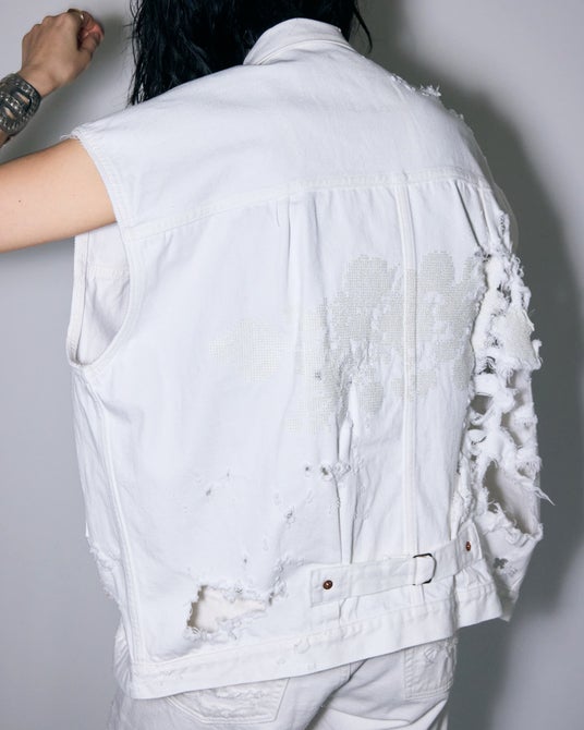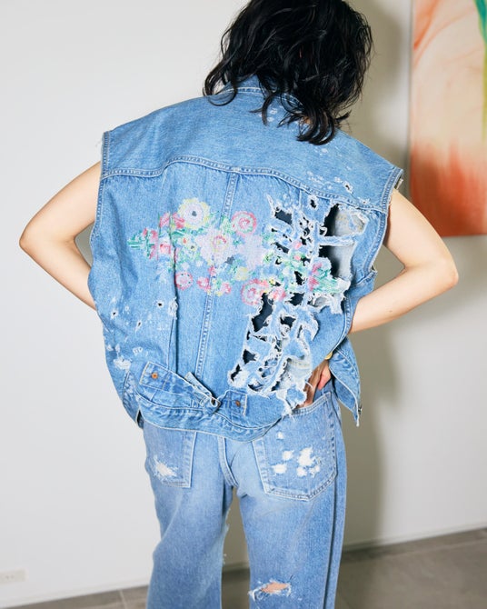 506XXをベースに、程よく色落ちさせたボディに、SEVESKIG 2024SSのシーズンテーマ「IF WE BREAK DOWN THE WALLS」(もし人と人、国と国の間に壁が無ければ)のタイポグラフィをレーザー加工でダメージとして入れています。東スラブ伝統の花、10種類(※)をAIに生成してもらい、それをクロスステッチデータに置き換え、グラデーション糸で刺繍。今回のコラボレーションでは、袖をカットオフしています。実際に袖を作り、加工後にカットオフする事で、リアリティを出しました。