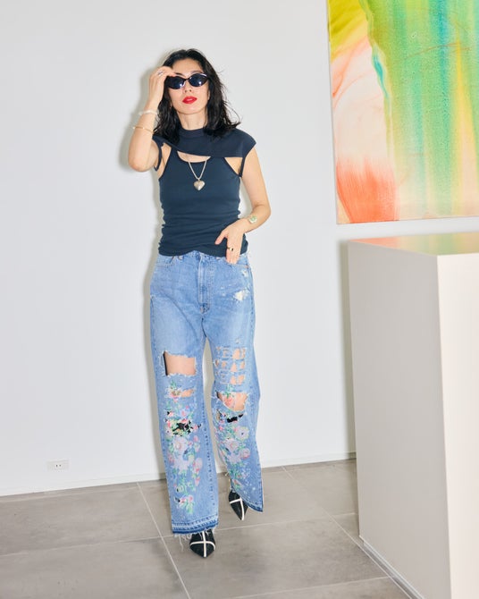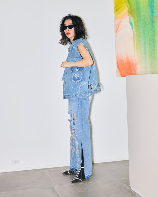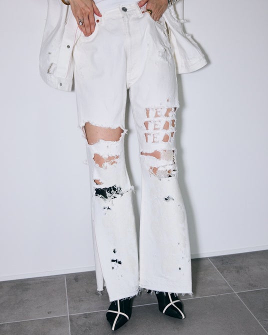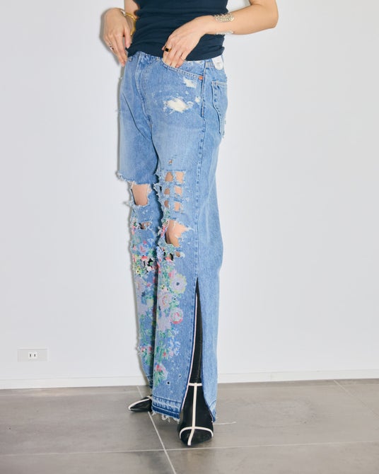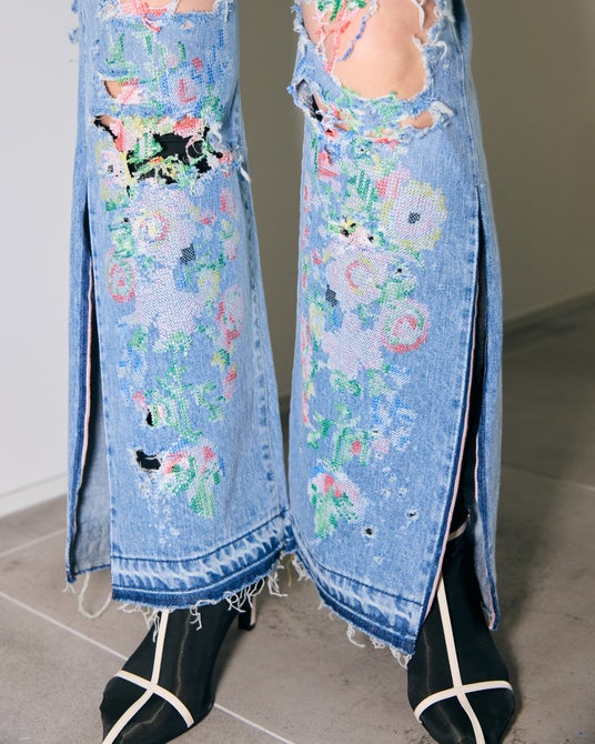 701をベースとし、縫製糸使いなども忠実に再現した5ポケットデニムパンツ。股上が深く、ヒップにかけて丸みがある女性らしいシルエット。加工後最終工程でスリット仕様に。SEVESKIG 同様、(un)decided 2024SSのシーズンテーマ「IF WE BREAK DOWN THE WALLS」(もし人と人、国と国の間に壁が無ければ)のタイポグラフィをレーザー加工でダメージとして入れています。ダメージ加工後に、穴の上から刺繍でリペアする特殊なクロスステッチ刺繍を施しています。DENIM JACKETと同様に、東スラブ伝統の花、10種類(※)をAIに生成してもらい、それをクロスステッチデータに置き換え、グラデーション糸で刺繍。今回のコラボレーションでは、丈感のバランスを修正し、裾を解く加工をプラスしています。